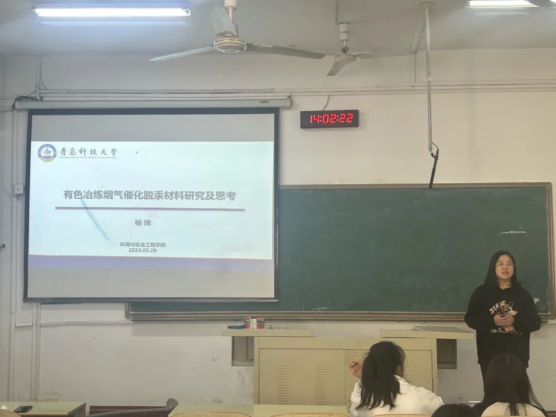 杨姝老师结合自己的科研成果,以有色冶炼烟气催化脱汞材料研究及思考为主题,向同学们介绍了重金属污染控制技术、资源回收利用及环境功能材料制备的相关内容,并就学术规划与发展、个人研究兴趣、如何保持学术热情等话题与同学们展开了深入探讨,鼓励同学们积极主动地学习。提问互动环节,杨姝老师针对同学们普遍关心的专业未来发展方向等问题进行了详细解答。