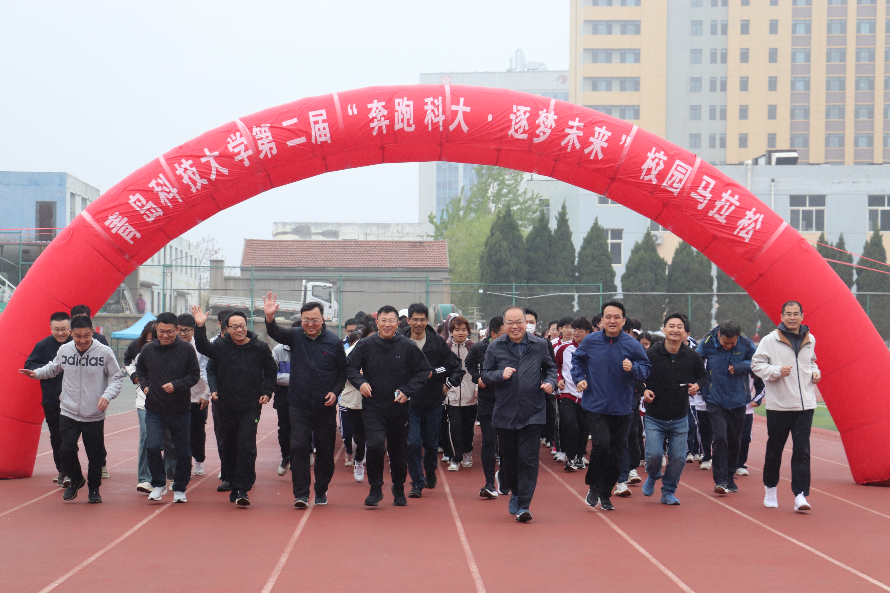 活动在庄严的国歌声中拉开帷幕,与会领导共同启动第五届“爱体育·兴科大”联赛嘉年华并为本次联赛活动承办单位授牌。各位参赛选手经过热身和充分的准备后,丁林等为第二届“奔跑科大·逐梦未来”校园马拉松赛“鸣笛开赛”。在欢送校园马拉松选手跑出青春赛道的同时,领导嘉宾加入体育联盟健康跑爱好者队伍,与其同步开跑。