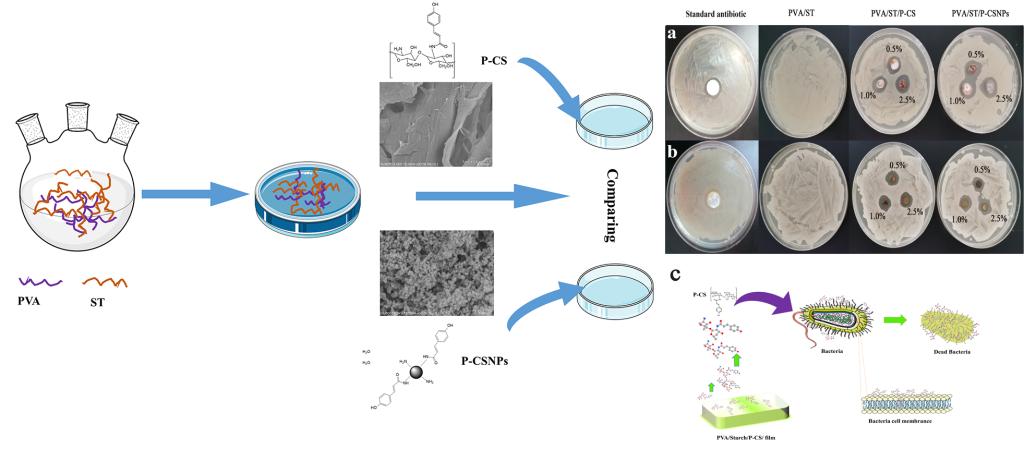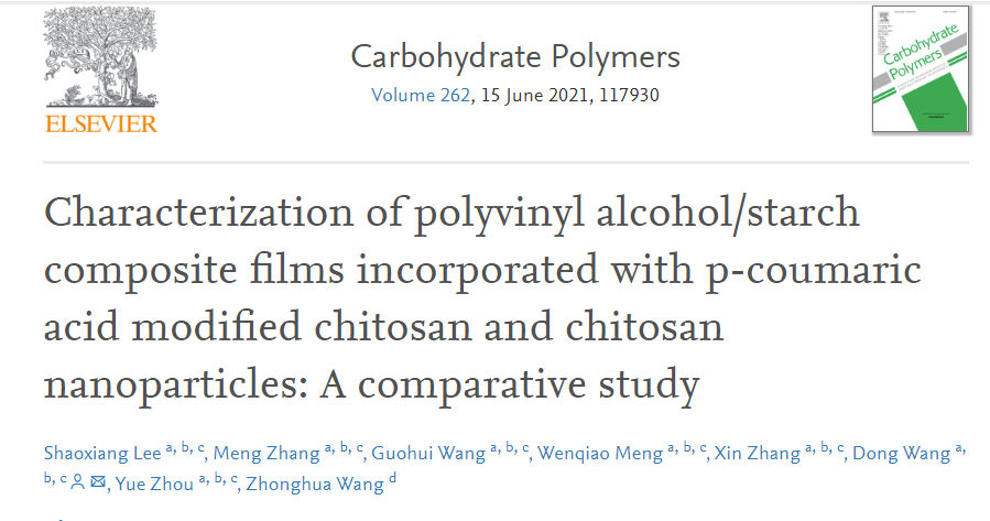 近日,yl23455永利官网李少香教授团队在前期研究工作的基础上开发了多种壳聚糖基抗菌、抗氧化材料并构建了相应的具有生物相容性食品包装膜,相关成果以“Characterization of polyvinyl alcohol/starch composite films incorporatedwith p-coumaric acid modified chitosan and chitosan nanoparticles: A comparative study”为题发表在国际知名期刊Carbohydrate Polymers(中科院一区TOP期刊,IF=7.182)上。