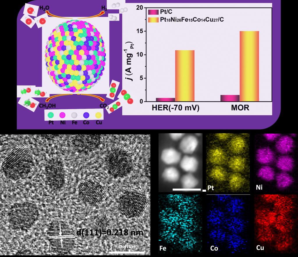 近日,青岛科技大学生态化工过程与技术泰山学者优势特色学科人才团队王磊教授、赖建平教授,在国际知名期刊Nature Communication上发表了题为“Fast site-to-site electron transfer of high-entropy alloy nanocatalyst driving redox electrocatalysis”高水平论文,报道了采用低温油相策略制备均匀且超小(〜3.4 nm)的高熵合金(HEA)PtNiFeCoCu纳米粒子。此催化剂表现出较强的析氢反应(HER)活性和甲醇氧化反应(MOR)活性以及优异的稳定性。