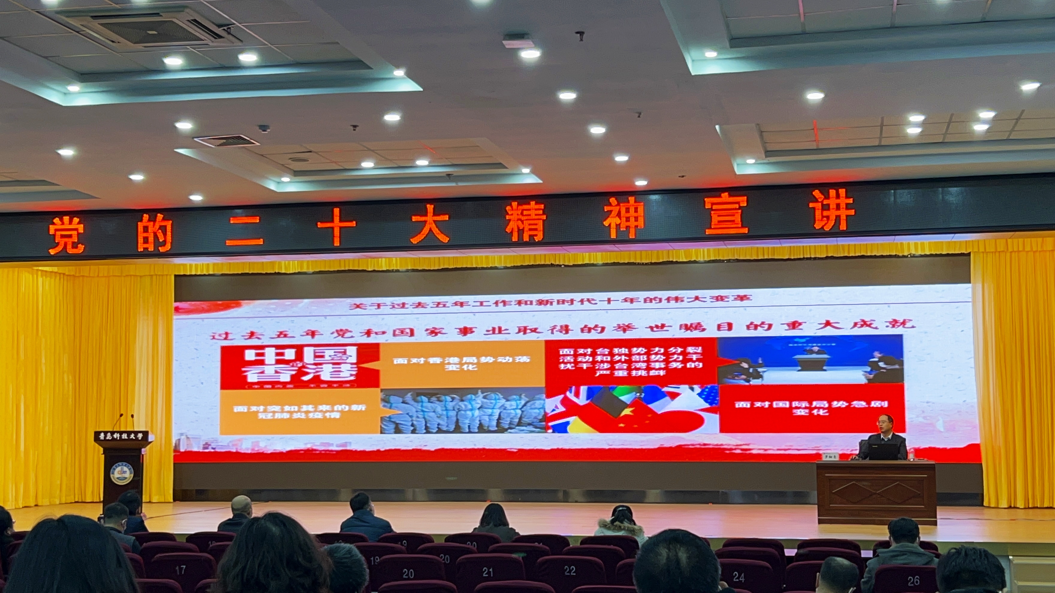 罗细亮从大会的主要议程为切入点,围绕“七个讲清楚”,深刻解读了党的二十大的主题、主要成果和报告起草的过程,过去五年的工作和新时代十年的伟大变革,马克思主义中国化时代化,中国式现代化,全面建设社会主义现代化国家的目标任务,坚持党的全面领导和全面从严治党,应对风险挑战,党的二十大报告中关于教育科技人才的战略部署等八个方面的主要内容。