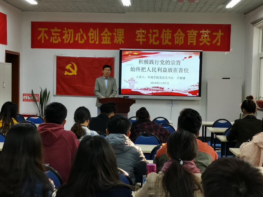 为深入推进学校党委“不忘初心、牢记使命”主题教育工作安排,近日,yl23455永利官网党总支书记吕德谦在学院楼3015会议室讲授了题为《积极践行党的宗旨,始终把人民利益放在首位》的主题教育专题党课。研究生党支部和本科学生党支部全体学生党员参加了党课学习。