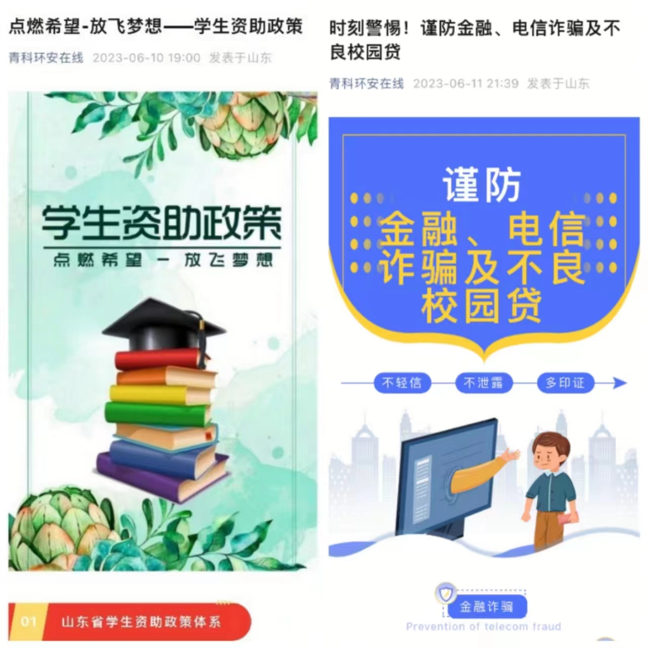 依托学院公众号发布的相关推文,先后开展形式多样的诚信主题教育活动。围绕“点燃希望、放飞梦想”主题开展学生资助政策宣传,从生源地信用助学贷款、高校毕业生学费和国家助学贷款补偿、减免学费、研究生学业奖学金、国家助学金等方面详细介绍政策内容,使同学们了解学生资助管理标准,确保家庭经济困难学生入学前、入学时和入学后“三不愁”。