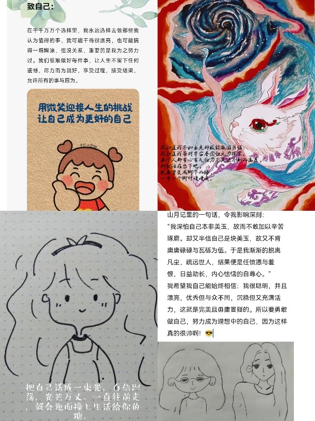 此外,学院依托线上平台开展“爱自己是终身浪漫的开始”作品征集活动,通过图文结合的方式,同学们晒出给自己画的一幅画,给自己写的一段话,送自己的一份礼物等。希望大家都能够从心出发,在“爱自己”的路上遇见未知的自己,更好的自己,让生命绽放最美的光芒。