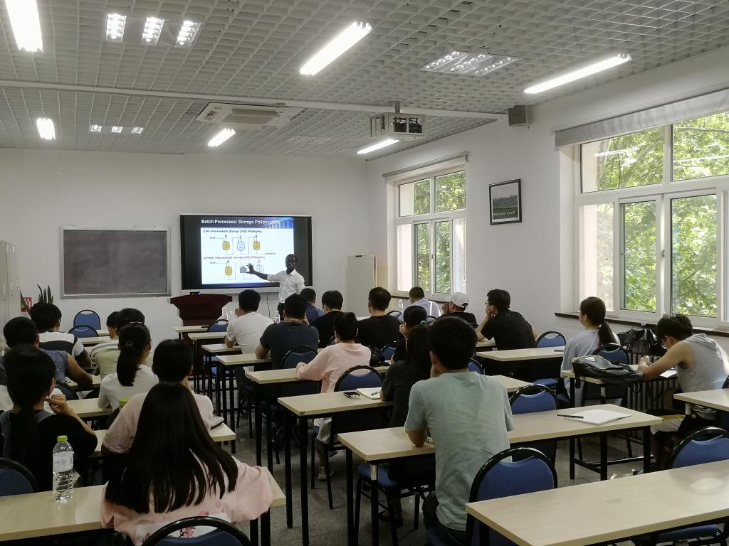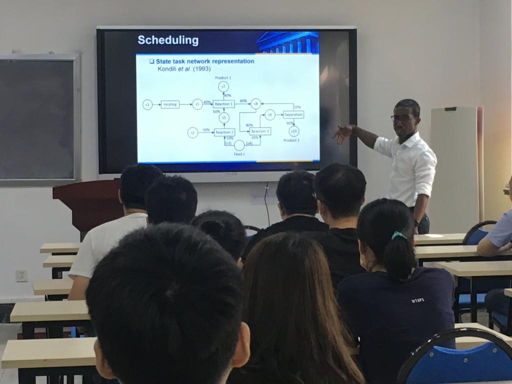 在生产生活中离不开水和能源公用工程,在此过程中存在着大量的节约机会。Majozi教授首先介绍了目前过程综合和优化的一般方法,进而以间歇过程为例介绍了如何将水-能耦联模型纳入详细数学模型考虑,创新地提出了若干求解策略。最后,Majozi教授以印度某牛奶公司为案例,详细介绍了模型建立和模型求解,以及挖掘节能减排节水减污的机会。讲座结束后,在场师生踊跃提问,气氛热烈,与Majozi教授进行了深入的沟通与交流。