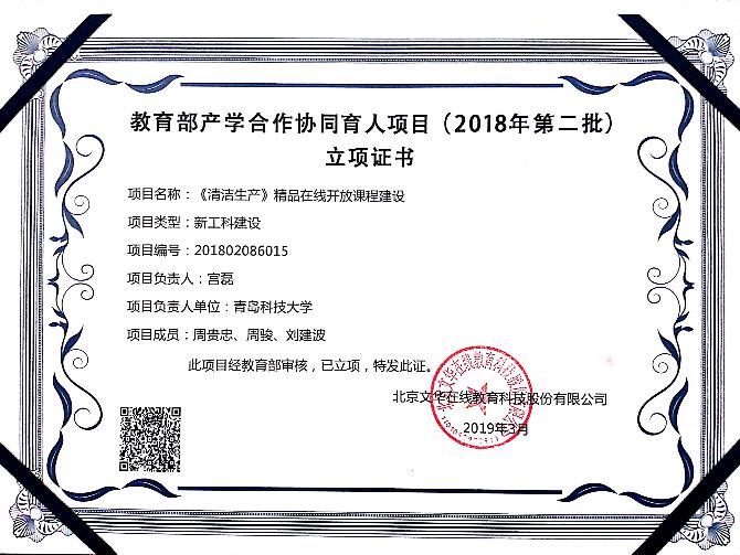 2018年第二批教育部产学协作育人项目“《清洁生产》精品在线开放课程建设”(201802086015,宫磊) |