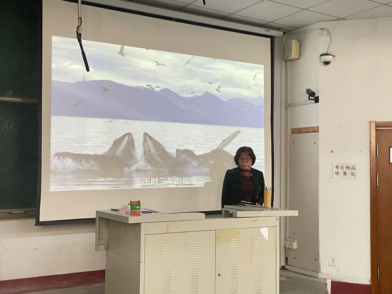 会后,李老师与同学们共同观看影片《鲸鱼的秘密》,该片主要讲述了由于自然环境破坏导致海洋污染严重,海底生物丧命甚至灭绝,以此警示同学们要珍爱地球,保护环境。