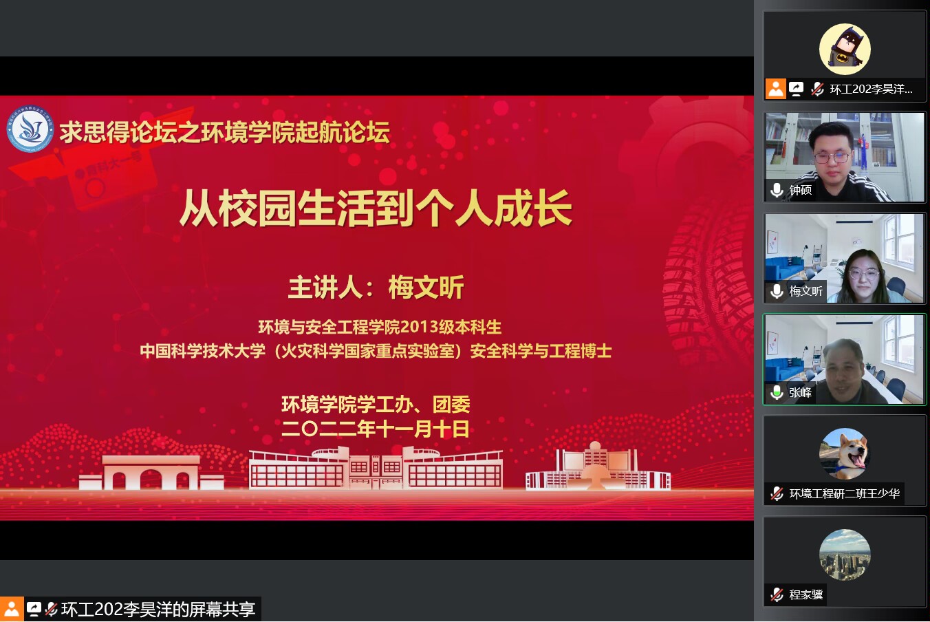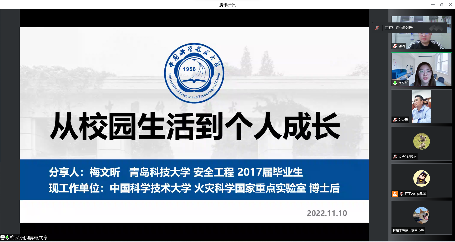 为进一步增加同学们对专业的了解,更好地规划学习生活,提升同学们的学习氛围,11月10日晚,yl23455永利官网于线上举办求思得论坛之yl23455永利官网起航论坛。本次论坛特别邀请了yl23455永利官网2013级本科毕业生、中国科学技术大学(火灾科学国家重点实验室)安全科学与工程博士梅文昕担任主讲人,yl23455永利官网副院长张峰、安全工程教研室张安元、程家骥老师出席此活动,学院学工办主任兼团委书记钟硕主持活动,安全学科本科生、研究生200余人参加本次活动。