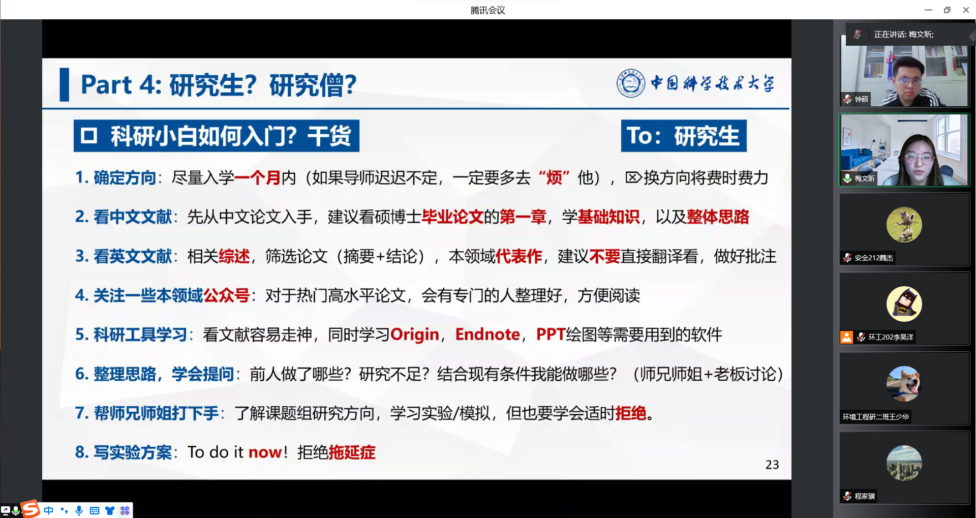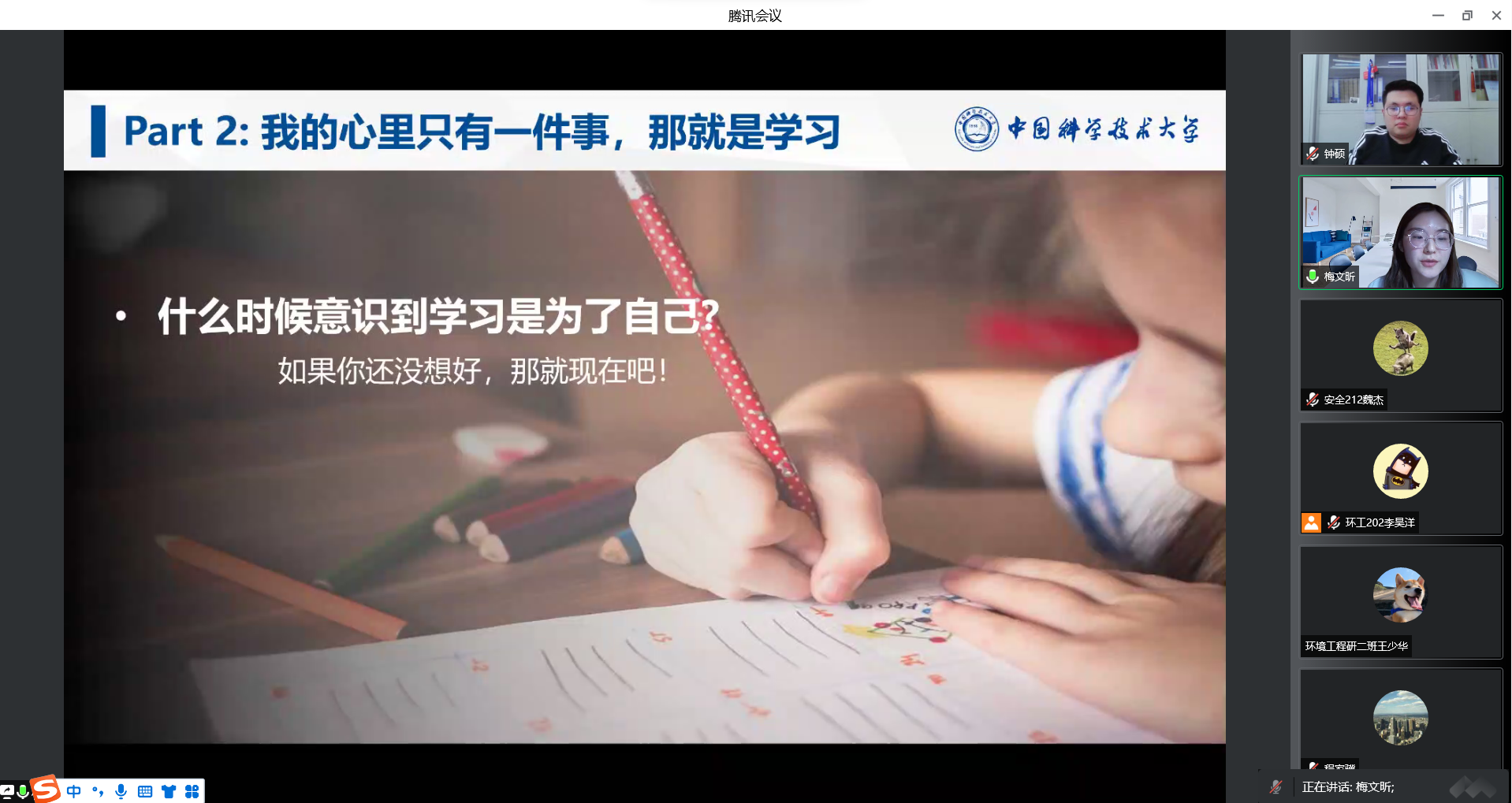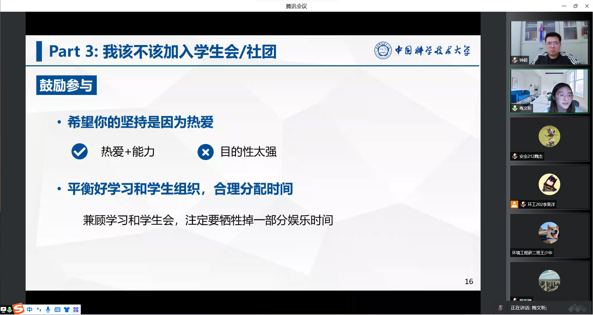 梅文昕从以下六个部分分享了自己的校园生活和个人成长,并对本科生和研究生学弟学妹们提出了宝贵的建议。第一部分中梅文昕回忆了自己在yl23455永利官网度过的大学生活,从学习、科研、友谊等各方面讲述了自己所获得的成长。梅文昕在第二部分着重强调了学习的重要性、必要性以及如何学习,她建议学弟学妹们在学习方面应接受自己的专业,并学好基础课和专业课,提高自己的GPA,为科研之路打下基础。在第三部分,梅文昕针对同学们关心的问题“我应不应该加入学生会或社团”提出了自己的见解,她鼓励同学们参与学生会、社团等学生组织,并建议同学们要平衡好学习和学生组织活动之间的关系、学会管理时间。在第四部分,梅文昕对要不要读研、怎样搞好科研以及读博问题发表了自己的见解。她提到,同学们要多参加创新创业竞赛项目,多学习工作软件的使用,在学习中寻找乐趣,找到适合自己的学习思路和方式,要学会调整自己的心态情绪,拒绝自我怀疑和自我否定。在第五部分的个人成长方面,梅文昕建议学弟学妹们要广泛交友但也要学会独处,要健康生活并持开心。最后,梅文昕对想要报考中国科学技术大学的学弟学妹们表达了鼓励和欢迎。