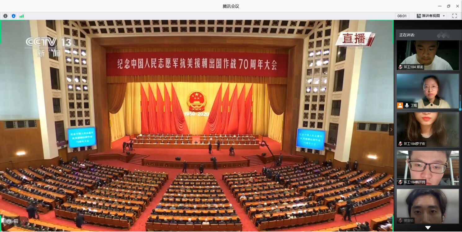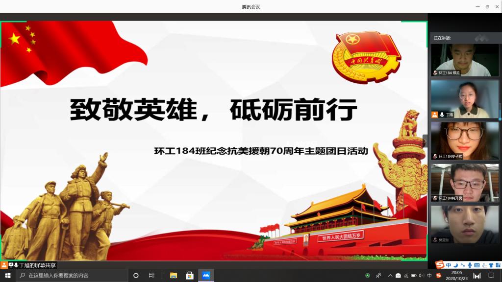 纪念抗美援朝70周年,铭记伟大胜利,致敬伟大英雄,学习和弘扬中国人民志愿军的伟大爱国主义精神和革命英雄主义精神,引导学生传承红色基因,树立崇尚英雄、继承遗志、不断奋进的良好风尚,1023日下午环工184团支部依托腾讯会议开展“致敬英雄,砥砺前行”线上主题团日活动。