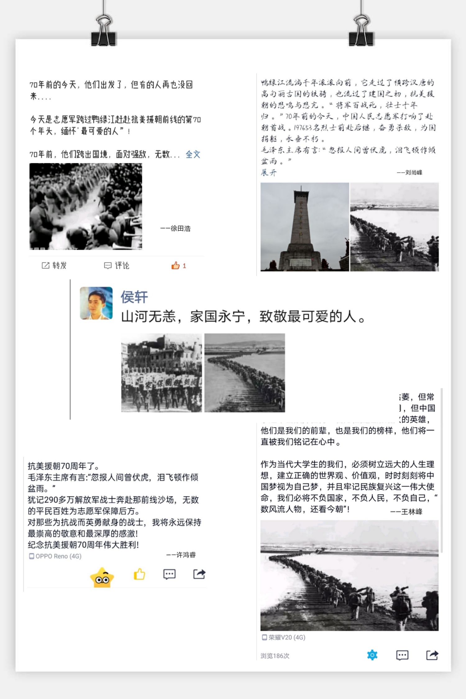 7:30,团支书组织支部成员观看“致敬抗美援朝七十周年”主题云团课。支部成员各自选择个人或者小团体的方式观看抗美援朝团课直播,通过课程直播了解抗美援朝战争,了解老一辈人的拼搏向上,更了解到青年肩上应有的责任与担当,使支部成员对抗美援朝的历史有了更进一步的了解随后,团支书号召支部成员在自己的空间、朋友圈、微博等社交平台发布自己对于抗美援朝战争的认识和感悟,支部成员表示,通过本次云团课深深地体会到了如今美好安康的来之不易,并激励自己在今后的学习生活中不断进取。