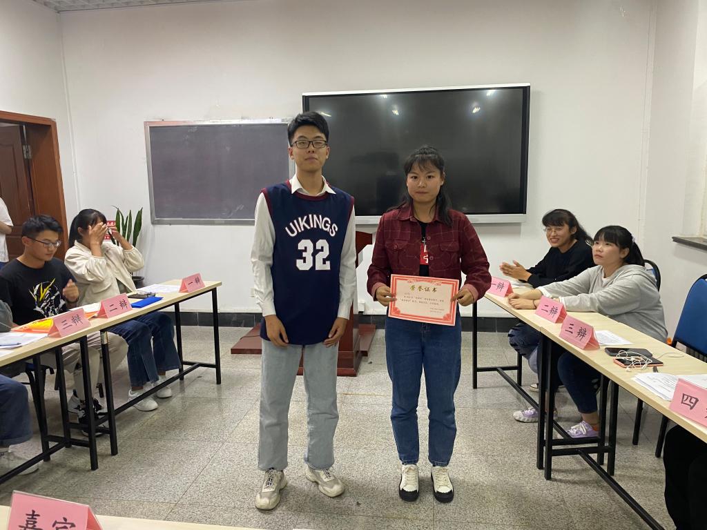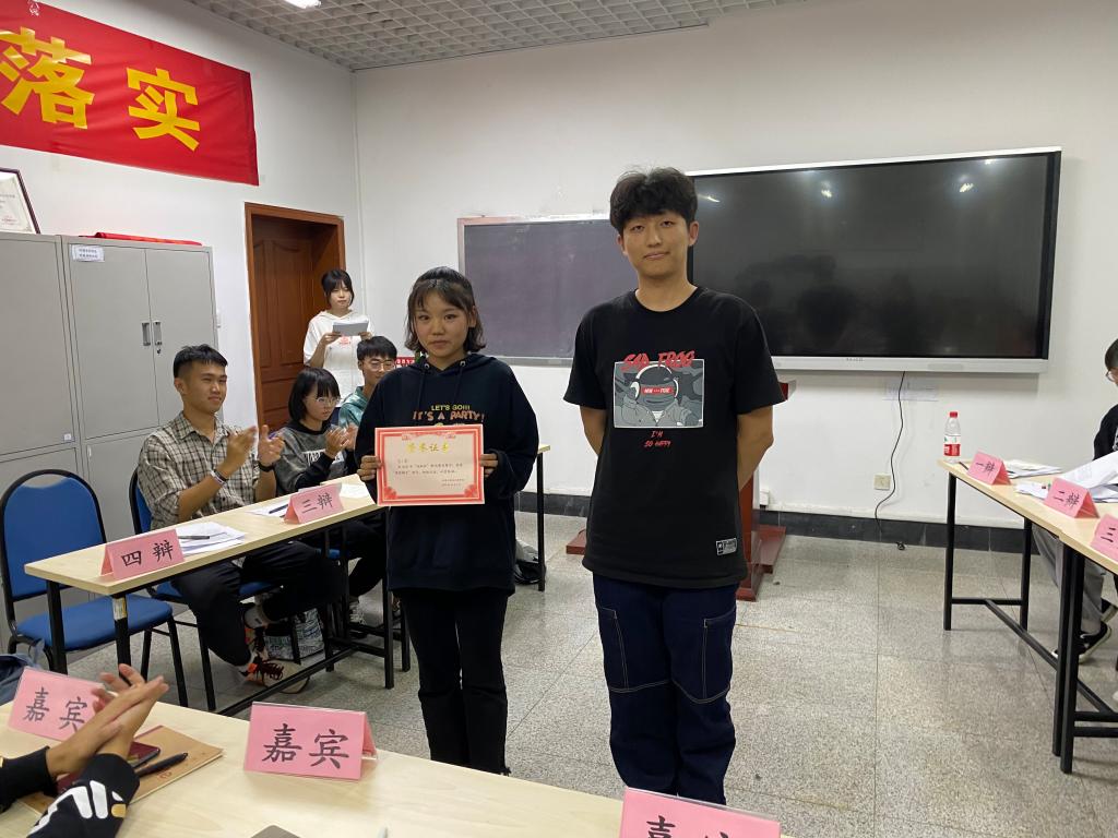 最终环工201和环工202获得了辩论赛的优胜,安全202贺小霞,环工204佐美智获得“最佳辩手”称号。学习部部长李彬、新媒体中心副主任李克分别为他们颁发奖状。
