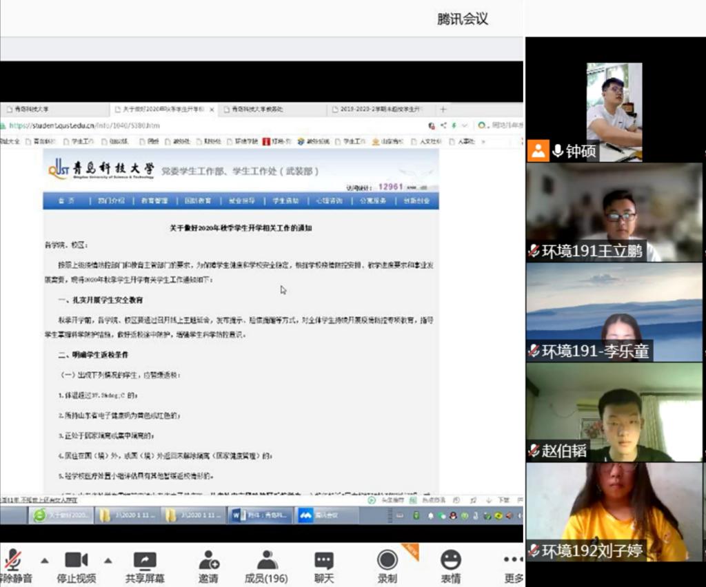 学院统一部署,压紧压实工作责任。学院高度重视学生返校开学期间疫情防控工作,并视为当前一个阶段学院工作的重中之重。根据学校要求,学院召开学生工作专题会议,具体细化落实学生返校方案。各年级辅导员迅速召开线上专题会议,精准解读上级相关要求,及时掌握学生相关信息。针对处在疫情中、高风险地区的学生,学院坚持“一人一议”,根据学生所处的实际情况,精准指导学生返校安排。学生返校后,实行“报备接龙”,凡是一名学生进入校园后,辅导员便第一时间知晓,以便时刻了解学生返校情况,打通学生平安返校“最后一公里”。
