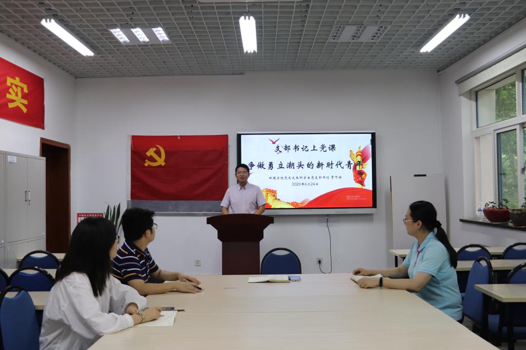 会上,党支部书记贾可好讲授了题为《争做勇立潮头的新时代青年》的主题党课,他对青年党员提出了三点要求:第一,读万卷书,行万里路,站在峰顶看前方;第二,勇敢去想,坚持去做,永远保持内心深处的“倔强”;第三,初心不忘,使命必达,走好有独木桥的阳光大道。他强调作为新时代青年,要坚持学习,始终走在时代前列,不论在何种环境下都要保持初心,不妄自菲薄,艰苦奋斗,不断朝着更高的目标奋进。