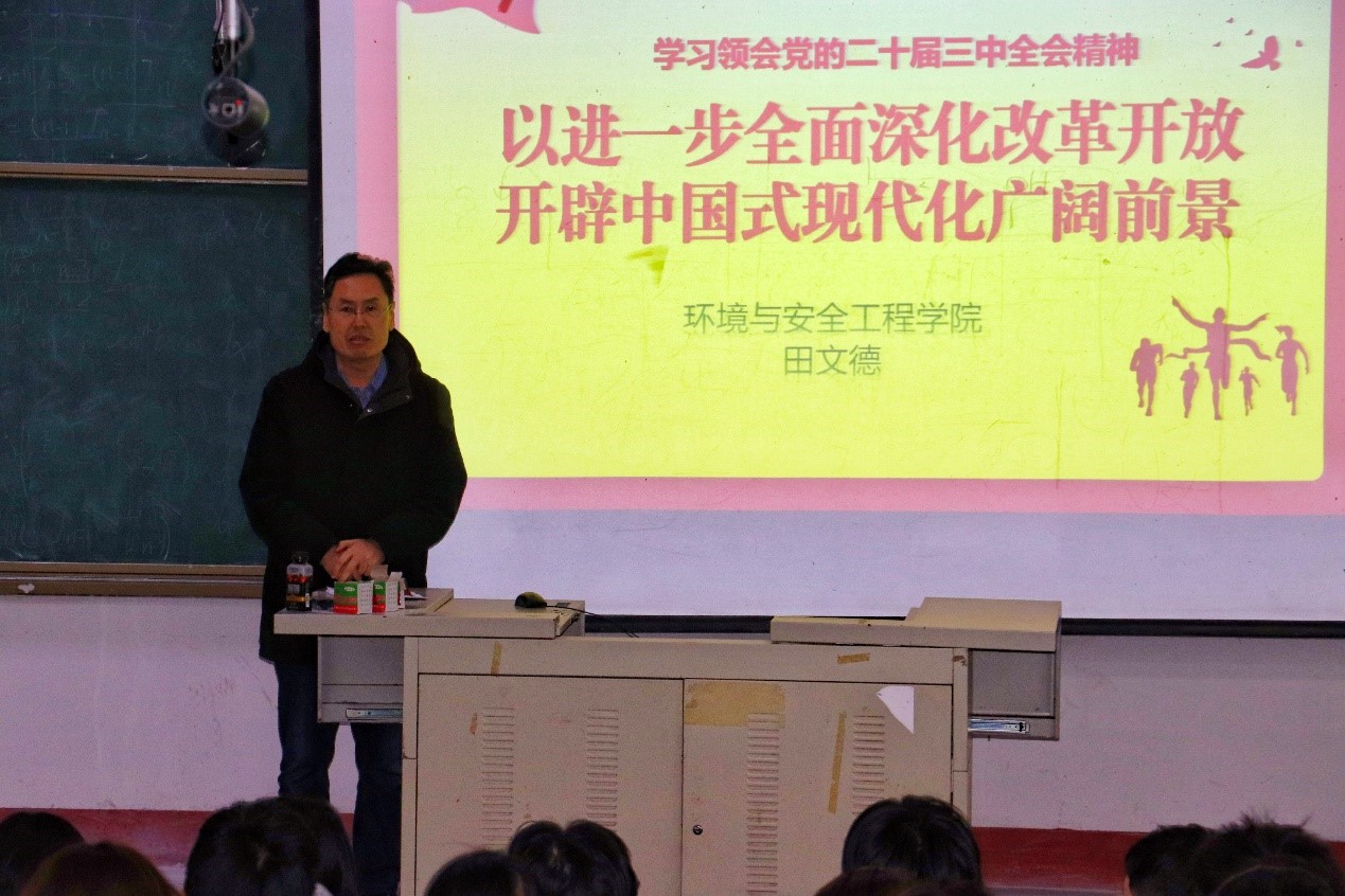 田文德围绕进一步全面深化改革的重大意义和总体要求、聚焦重点在更高水平上进一步全面深化改革、提高党对进一步全面深化改革的领导水平三个方面进行宣讲,将全面深化改革的总体要求和当下社会问题与学员所学专业结合起来,借助丰富生动案例,引导同学们深入准确领会把握党的二十届三中全会精神,立足实际推动学校改革发展。