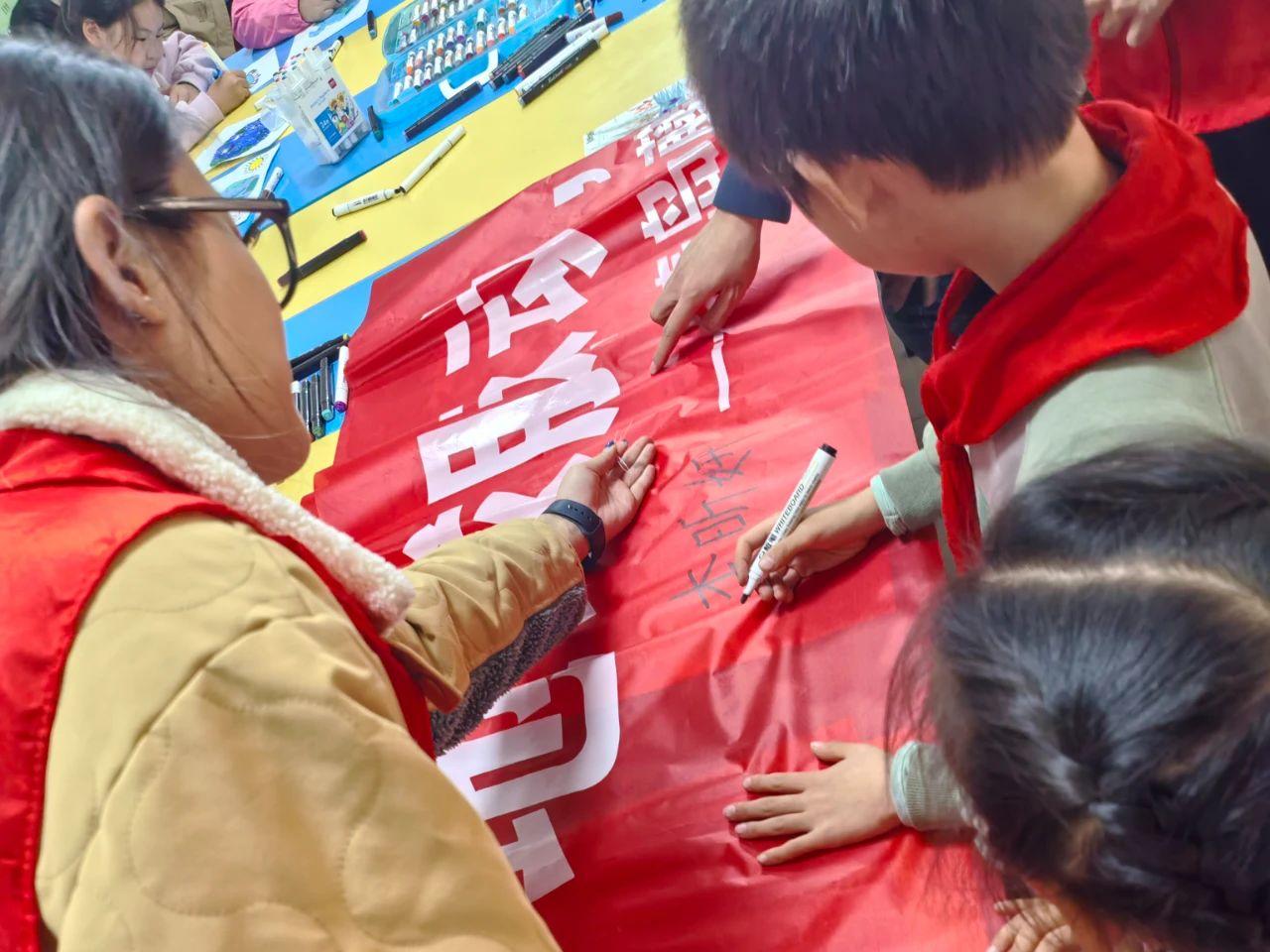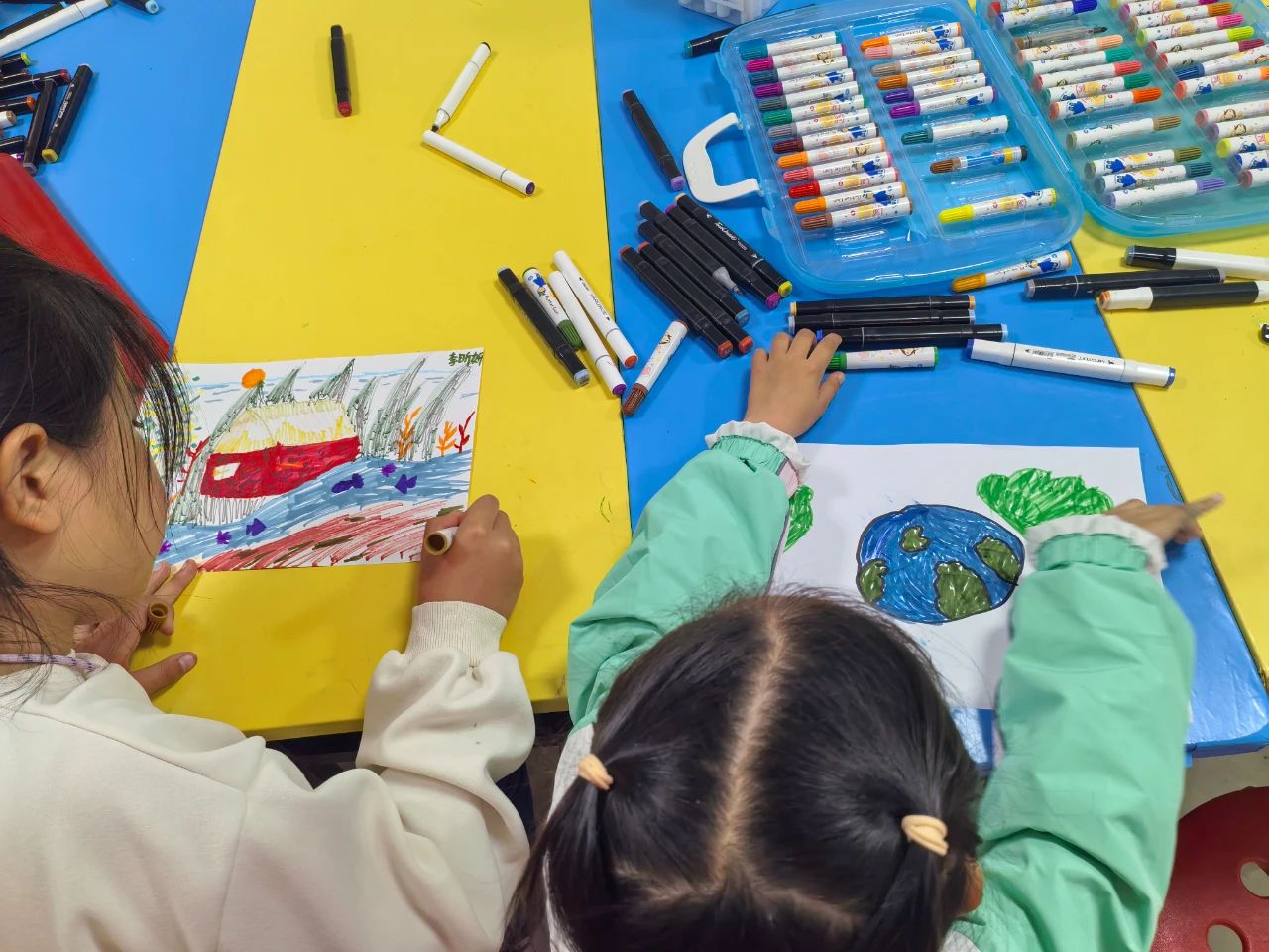 在手绘环节。志愿者们为小朋友发放了彩笔和画纸,鼓励大家发挥想象,通过手绘画表达对美丽地球的向往与热爱。最后,志愿者们引导小朋友们在横幅上签名,表达自己践行环保理念的决心。