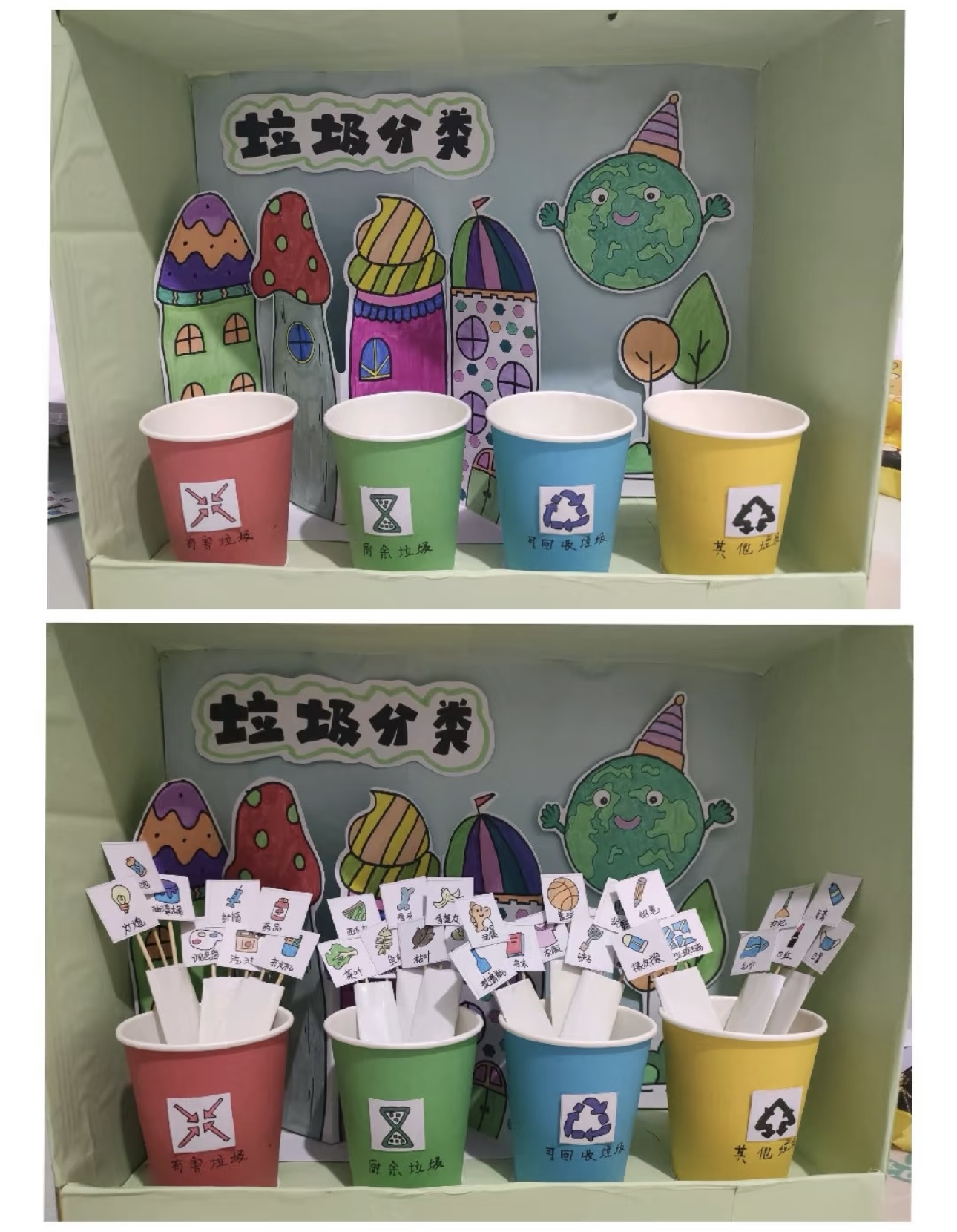 环境241班徐佳琪的作品《垃圾分类》,用四个不同颜色的纸杯分别代表有害垃圾、厨余垃圾、可回收物和其他垃圾,里面放置了画有各类垃圾图案的卡片,让同学们能够直观地进行垃圾分类的模拟投放。这一创意作品加深了同学们对垃圾分类的理解,巧妙地传递了“变废为宝”的环保理念。