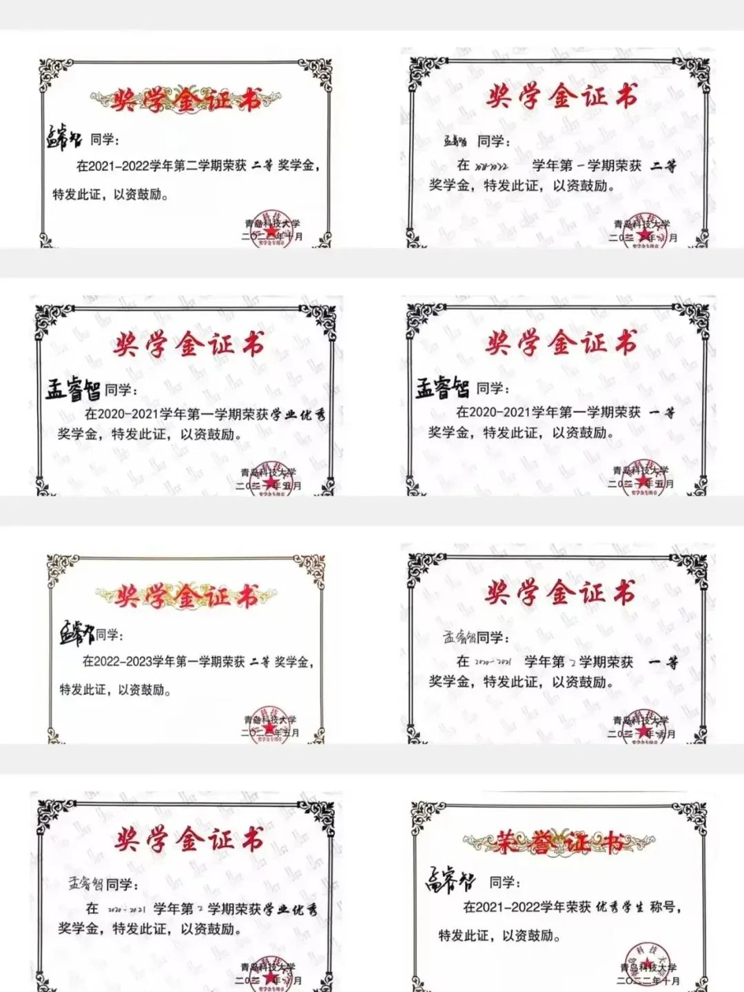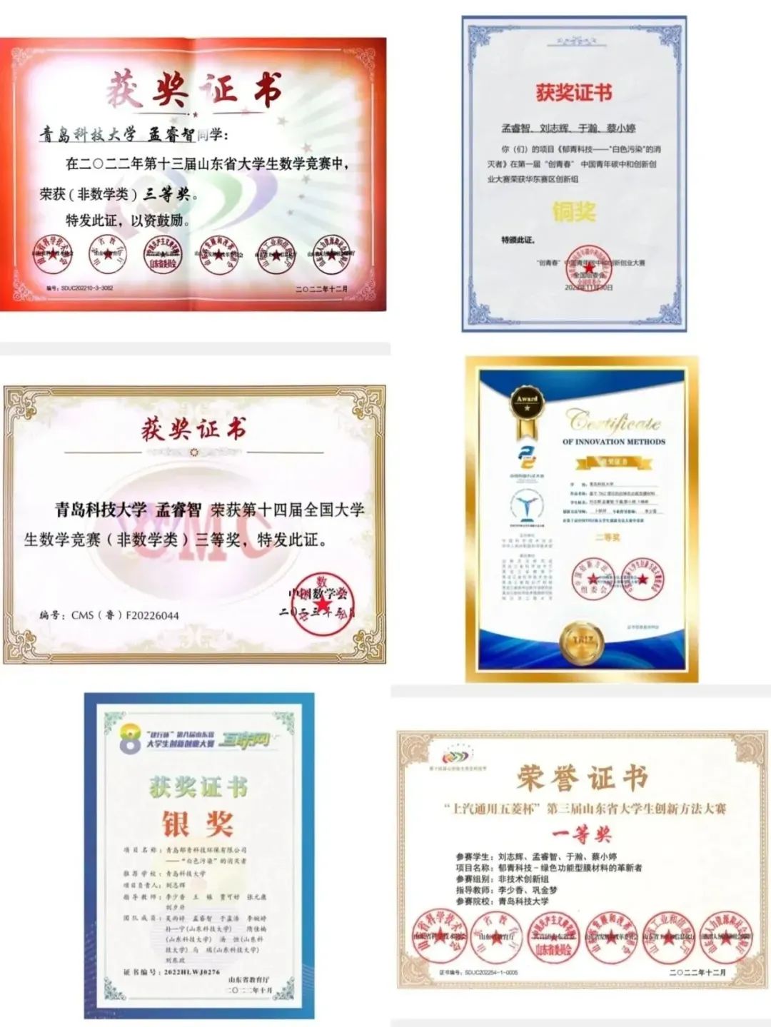 青岛银行学业奖学金,海科环保社会实践奖学金,大爱慧心健康企业奖学金,青岛科技大学一等综合奖学金,青岛科技大学二等综合奖学金,青岛科技大学学业优秀奖学金,青岛科技大学优秀学生,2022年校运动会男子4*100m第七名,青岛科技大学疫情防控青年志愿者。