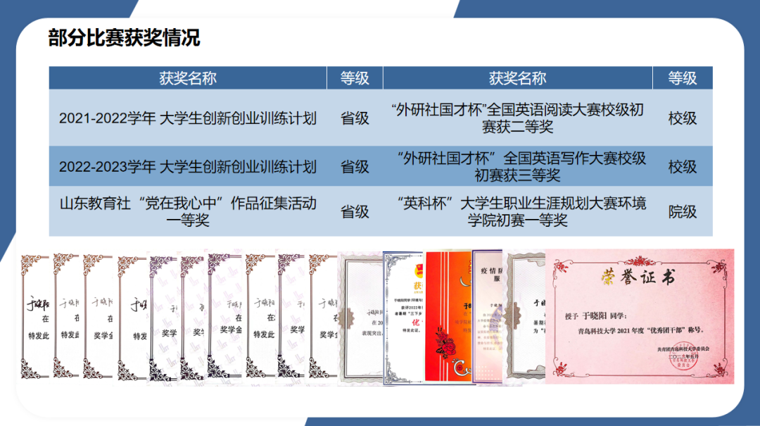 作为负责人带领团队成员两次参与“三下乡”社会实践,获校级“三下乡”优秀学生。积极响应团委号召,两次参加“青鸟计划”,进入政府部门,为民众办实事,助力社会基层建设,服务时长累计达300小时。疫情防控期间,在校担任党员青年突击队队员,在学校疫情防控核酸检测活动中志愿服务50 余小时,寒暑假期间作为社区青年志愿者,入户登记,设卡防控,为家乡疫情防控贡献青年力量。